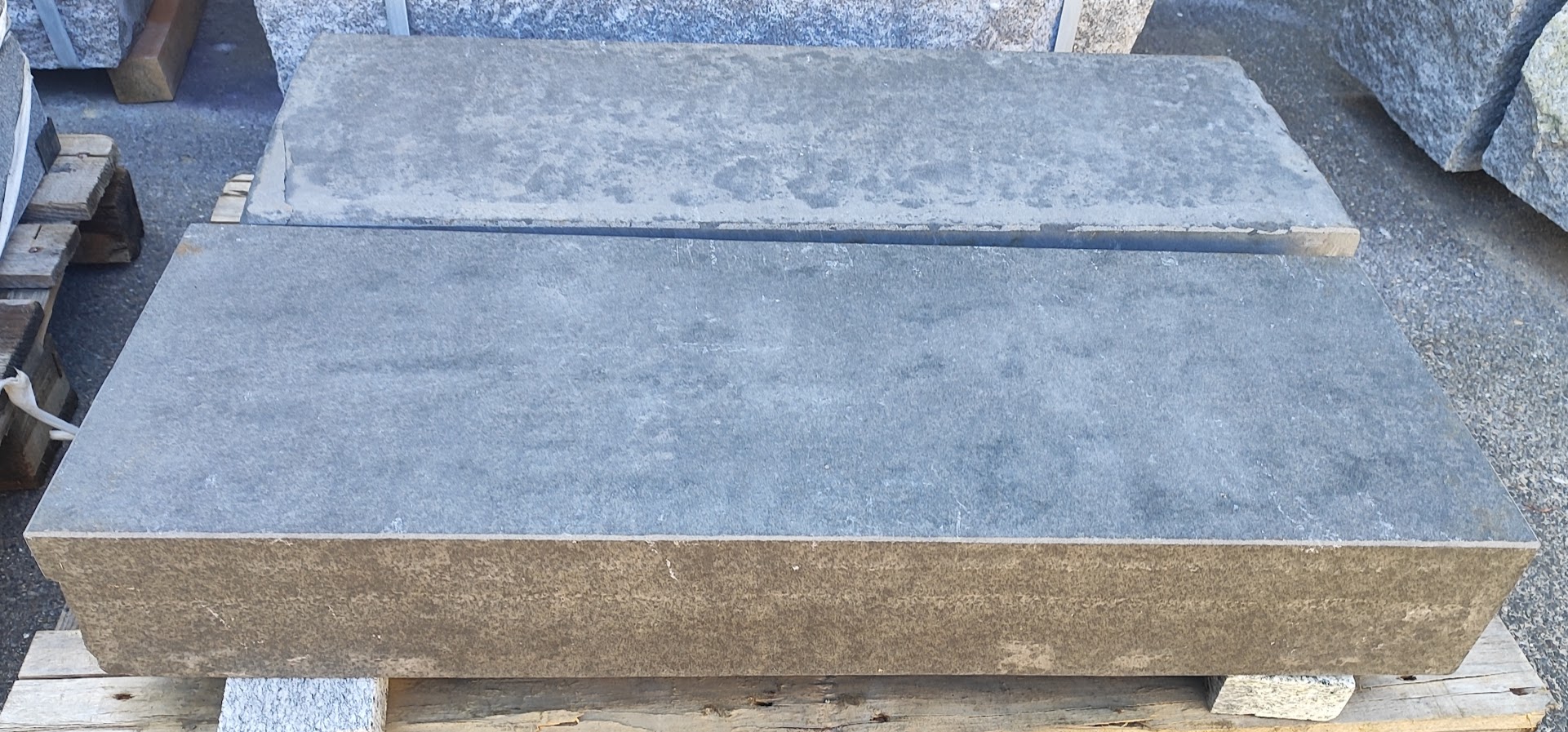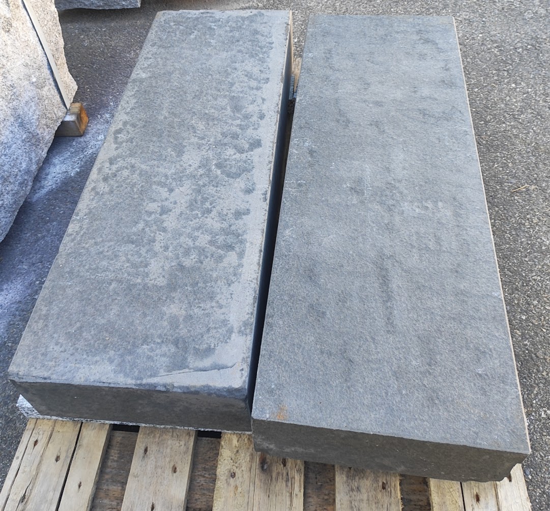Basalt anthrazit (Vietnam)BlockstufenOberfläche geflammtStirnkante + 2 Köpfe geflammtKanten + Ecken mit div. Beschädigungen (siehe Fotos)100 x 35 x 15 cm